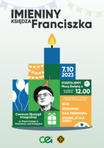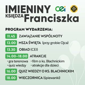 Już niedługo, bo 4 października Czcigodny Sługa Boży, ks. Franciszek Blachnicki, obchodzi swoje imieniny. W roku pięknych jubileuszy oraz uhonorowania naszego Ojca Orderem Orła Białego, serdecznie zapraszamy do Krościenka nad Dunajcem na imieniny ks. Franciszka. W sobotę, 7 października o godzinie 12.00 przy grobie Ojca zostanie odprawiona Msza święta, a po niej zapraszamy na dalsze świętowanie w Centrum Ekologii Integralnej (ul. Ks. Blachnickiego 2, u stóp Kopiej Górki). Planujemy gry terenowe, quizy, śpiewanki, pokazy filmowe i inne atrakcje dla całych rodzin. Będziemy też palić grilla, więc wszystkich przyjeżdżających prosimy o zabranie czegoś na ruszt. Zapraszamy Was bardzo serdecznie do przyjazdu całymi kręgami i wspólnotami, aby tego dnia móc cieszyć się i dziękować Panu Bogu za dar Ruchu Światło-Życie i jego Założyciela. Link do zaproszenia na FB: Imienieny ks. Blachnickiego Nawigacja wpisu Nowe pary rejonowe Konferencja Biblia o finansach