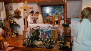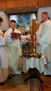 Tegoroczne Triduum Paschalne dane nam było przeżywać w formie rekolekcyjnej w Ciężkowicach. Wraz z nami wzięło w nim udział ponad 100 osób: 22 małżeństwa należące do Domowego Kościoła z 60 dzieci oraz 2 animatorki młodzieżowe Ruchu Światło- Życie (Teresa i Wiktoria). Uczestnicy przyjechali z różnych diecezji: gliwickiej, łódzkiej, rzeszowskiej, sandomierskiej, warszawskiej, warszawsko- praskiej i oczywiście tarnowskiej. Opieką duchową otaczali nas księża: Sylwester Brzeźny i Krzysztof Fejkiel, dzięki którym poszczególne tajemnice paschalne stawały się dla nas bardziej czytelne, nawet jeśli łączyły się z pewnymi paradoksami. Za służbę liturgiczną odpowiedzialny był ceremoniarz Wojtek. Misteria Wielkiego Czwartku, Wielkiego Piątku, Wielkiej Soboty i Wigilii Paschalnej z procesją rezurekcyjną uświetniła diakonia muzyczna w składzie: Lidia i Piotr, Izabela i Jacek oraz Maria i Tomasz. Sporą gromadką dzieci opiekowali się Katarzyna i Grzegorz, a w tym trudnym zadaniu wspomagała ich młodzież: Kasia, Julia, Kasia, Marysia i Grzegorz. Triduum Paschalne wraz z Rodzinami Domowego Kościoła i młodzieżą przeżywali również mieszkańcy Domu Rekolekcyjnego. Dzięki wielkiej pracy sióstr służebniczek dębickich- Terezity, Ewy i Serwacji- dbających tak o wystrój domu, jak i o smaczne posiłki mogliśmy w głębokim skupieniu celebrować tajemnice męki, śmierci i zmartwychwstania Jezusa Chrystusa. Magdalena i Wojciech Szerszeniowie Nawigacja wpisu Ciemna jutrznia z Diakonią Modlitwy Akt zawierzenia Ruchu Światło-Życie diecezji tarnowskiej Bożemu Miłosierdziu